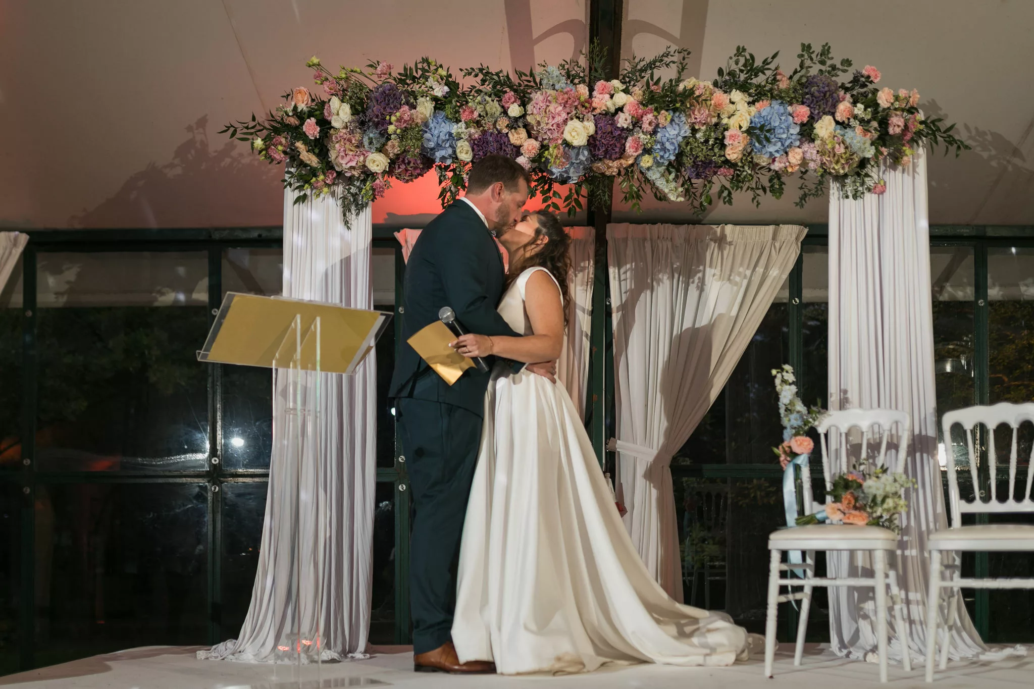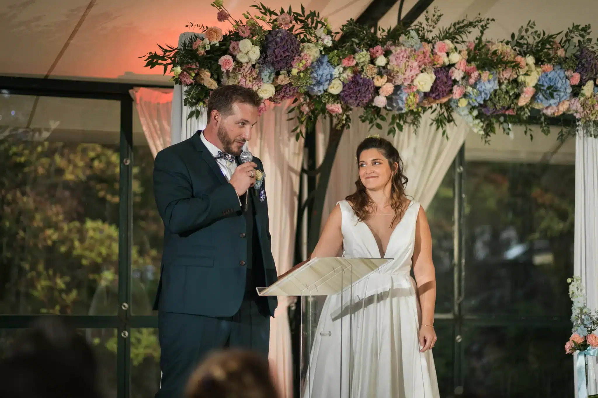 La suite des festivités se déroule au Domaine de la Butte Ronde, où la cérémonie laïque sous la verrière rassemble famille et amis. Animée par une amie de la famille et les témoins, elle est rythmée par des rituels symboliques et des discours sincères. L’ensemble de la journée a été orchestré avec fluidité par Charlotte Beuvelet, wedding planner chez CM Event Coaching, dont l’accompagnement a permis aux mariés de profiter pleinement de chaque instant, sans stress.