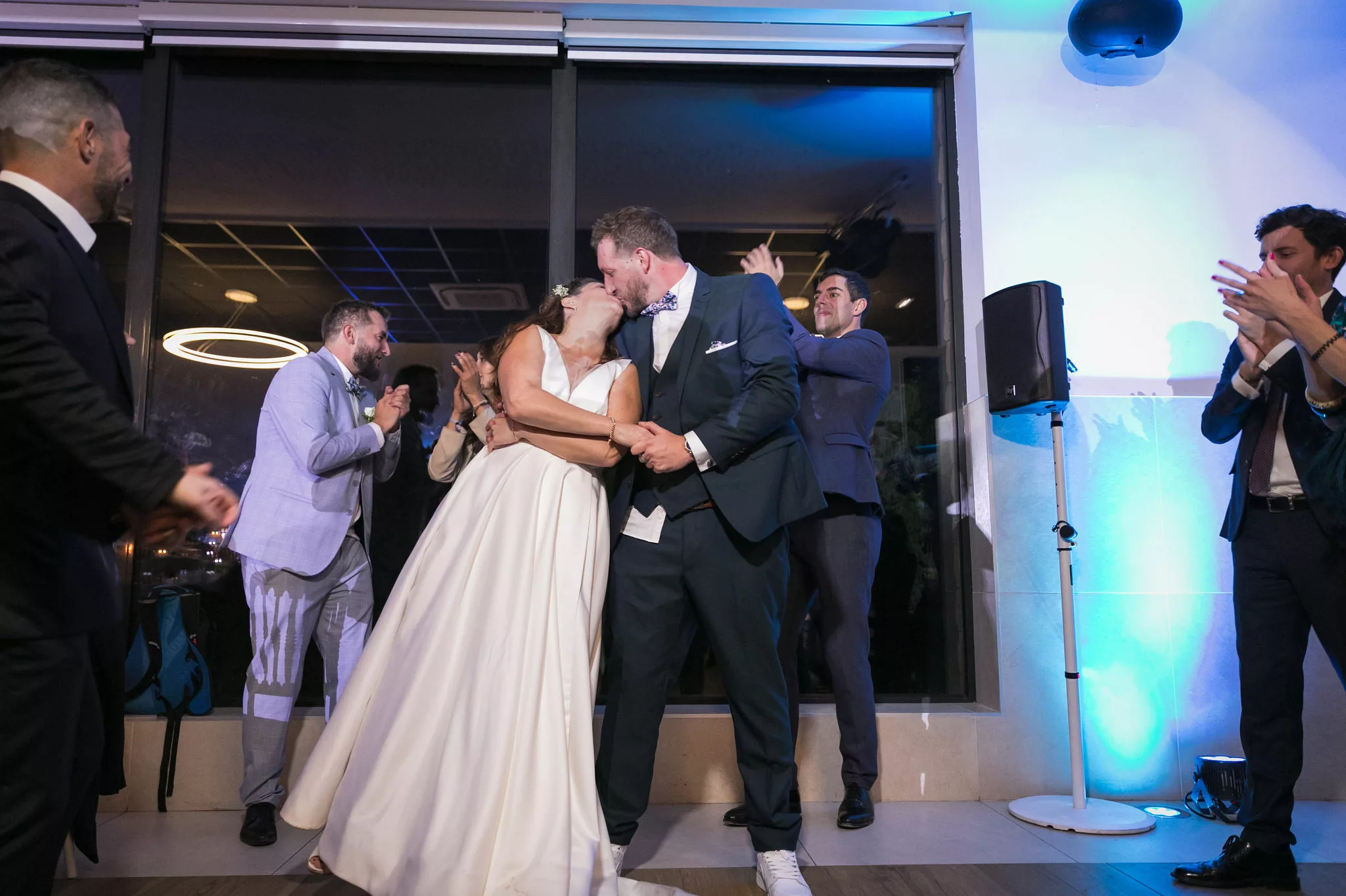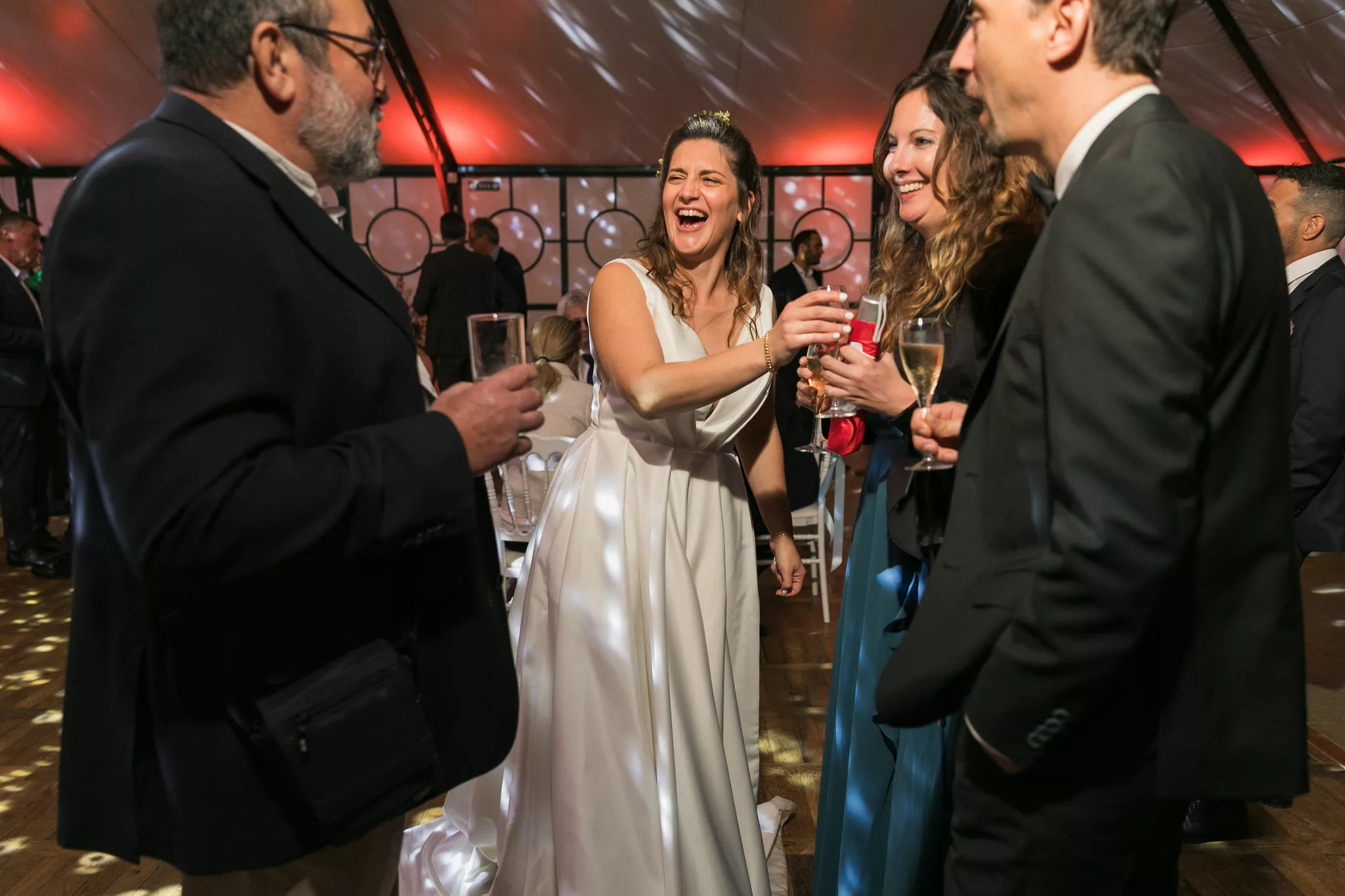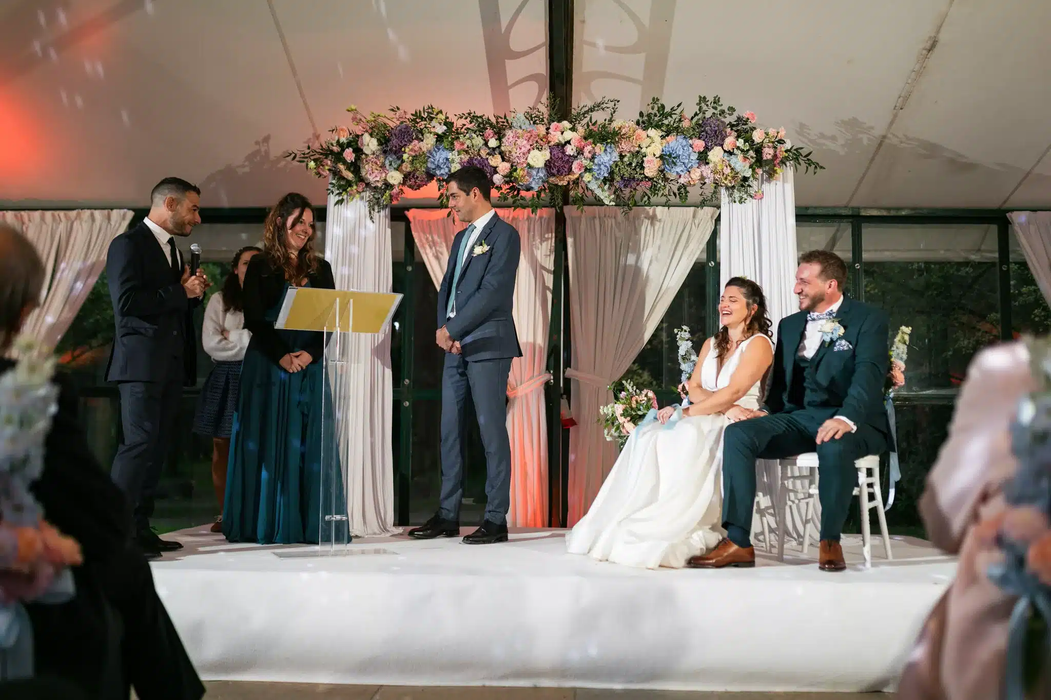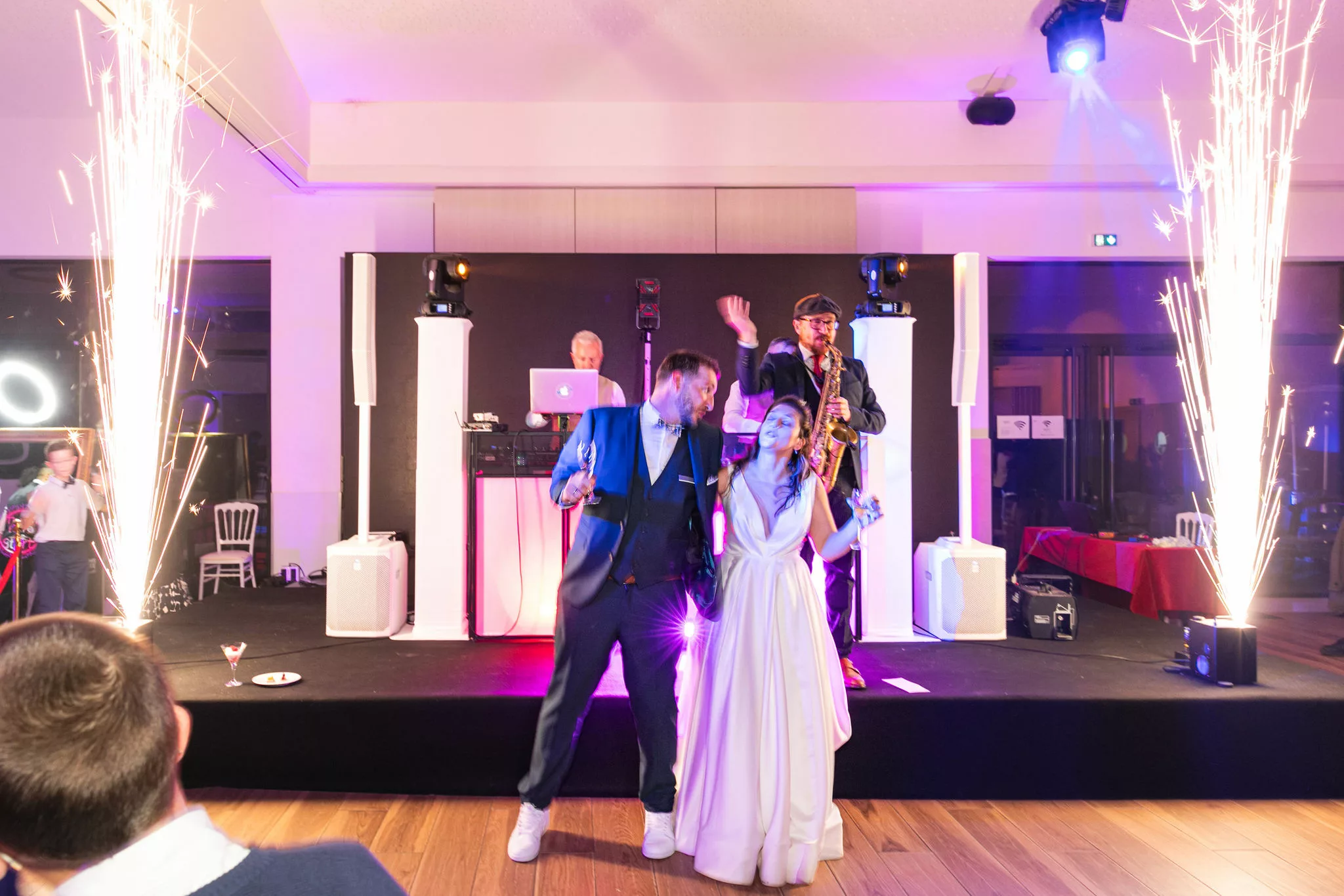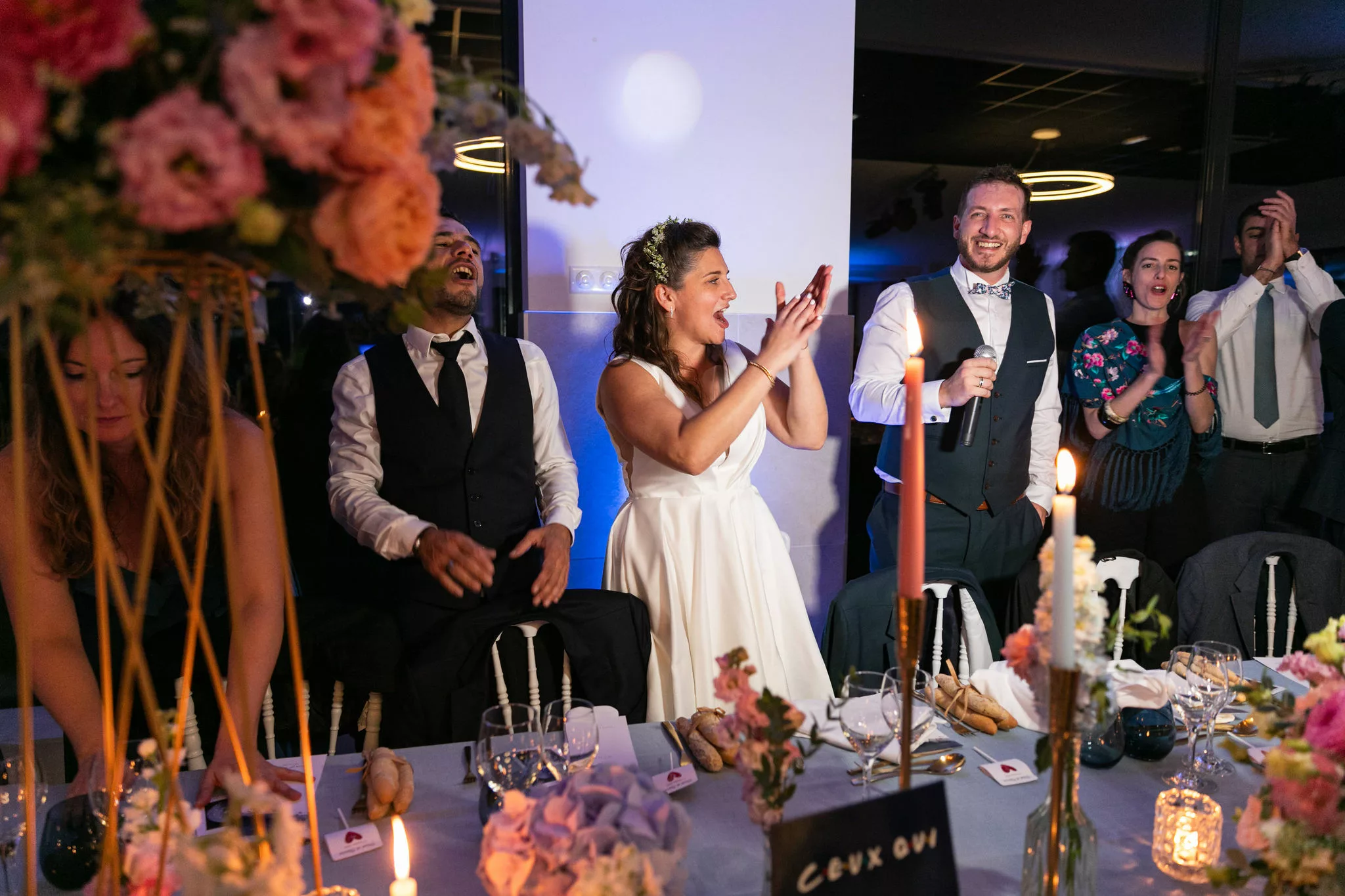 Après la cérémonie, le cocktail prend des airs de véritable moment de partage, porté par un groupe de musique live qui donne immédiatement le ton. Les invités profitent du cadre, échangent, rient et se laissent porter par cette ambiance conviviale avant de rejoindre la salle pour le dîner servi à 130 convives par L’Atelier Traiteur. Certains temps forts de l’animation rappellent aussi l’importance des jeux et moments participatifs, à l’image du célèbre jeu des 12 mois, toujours très apprécié des invités.