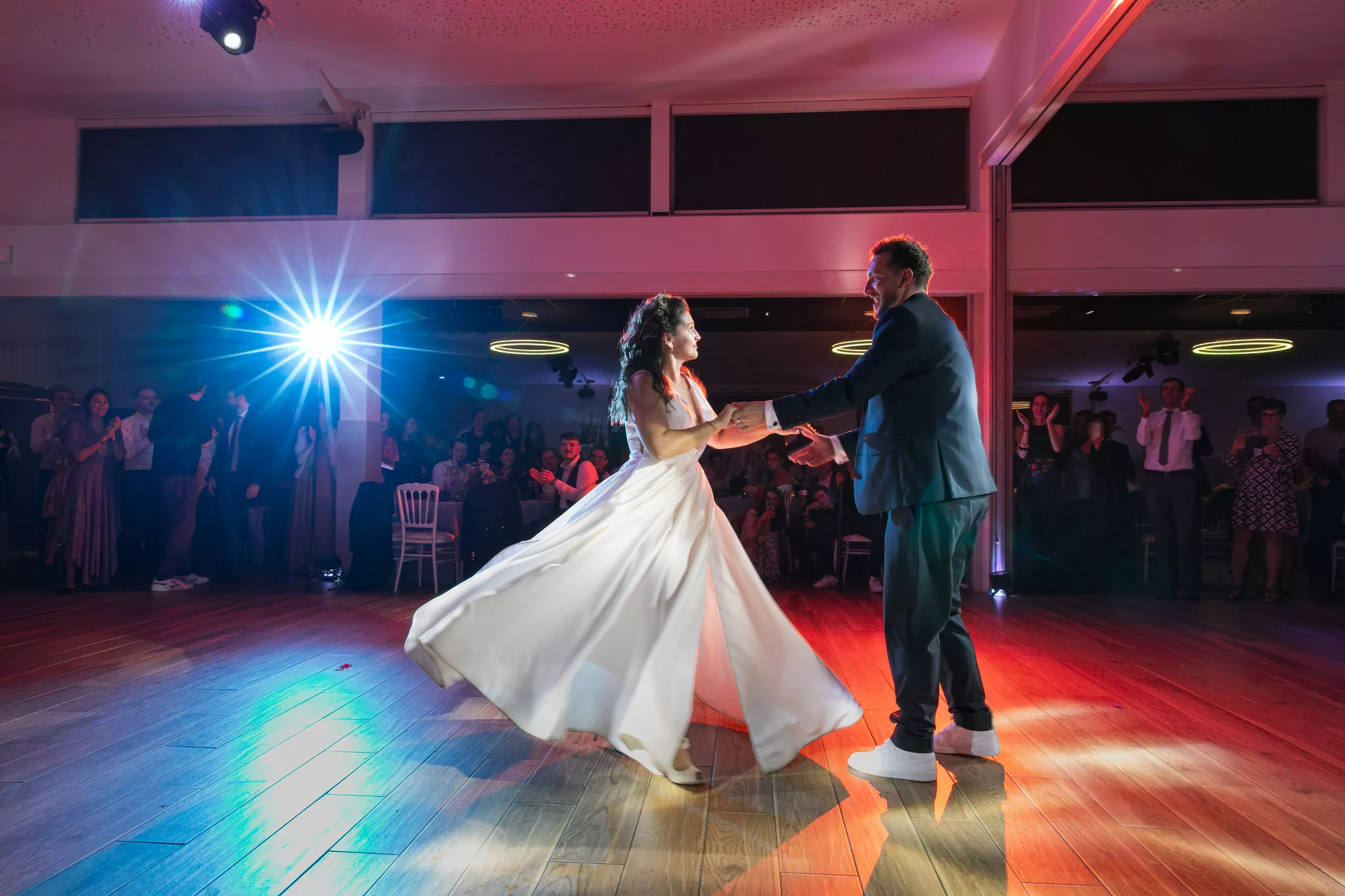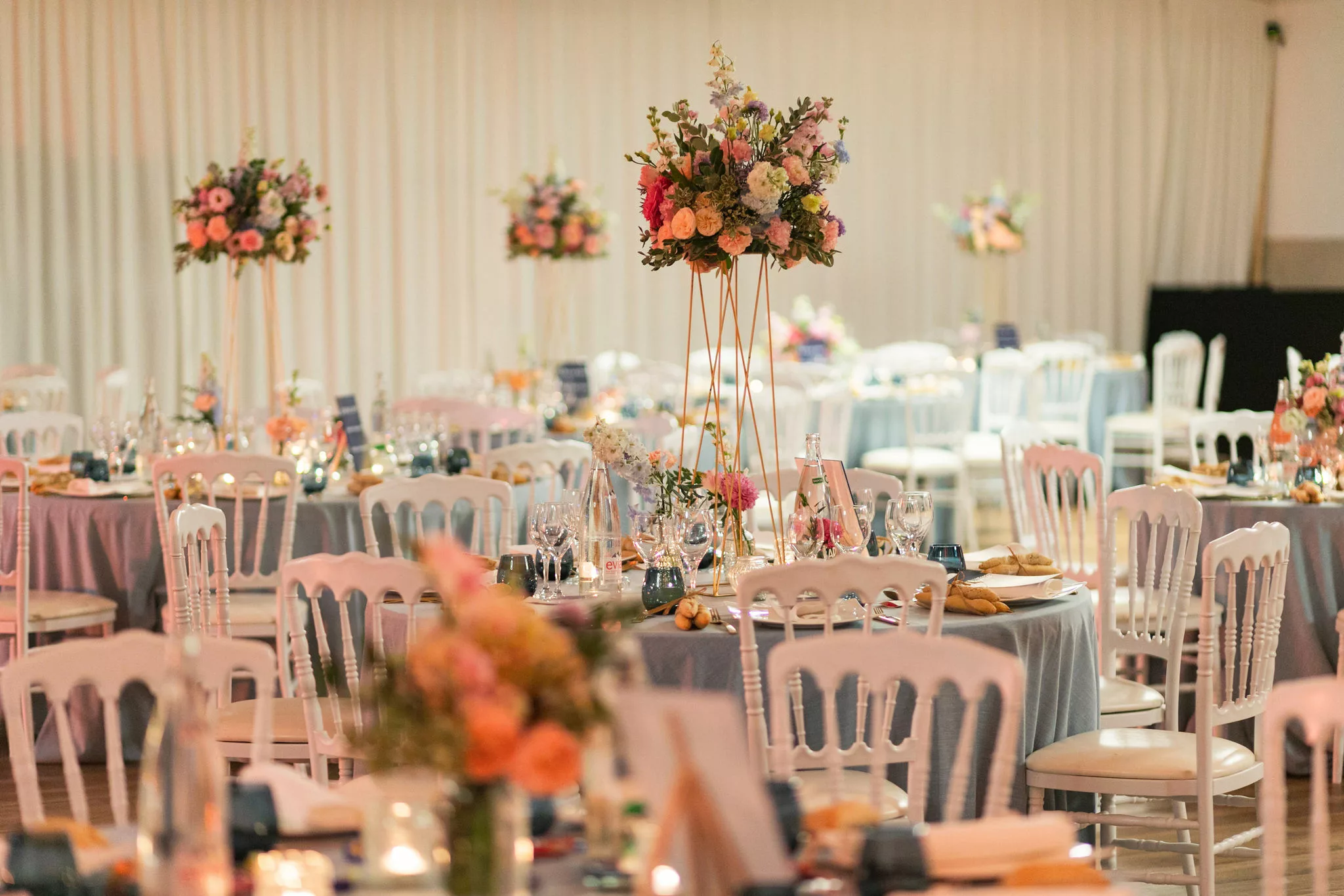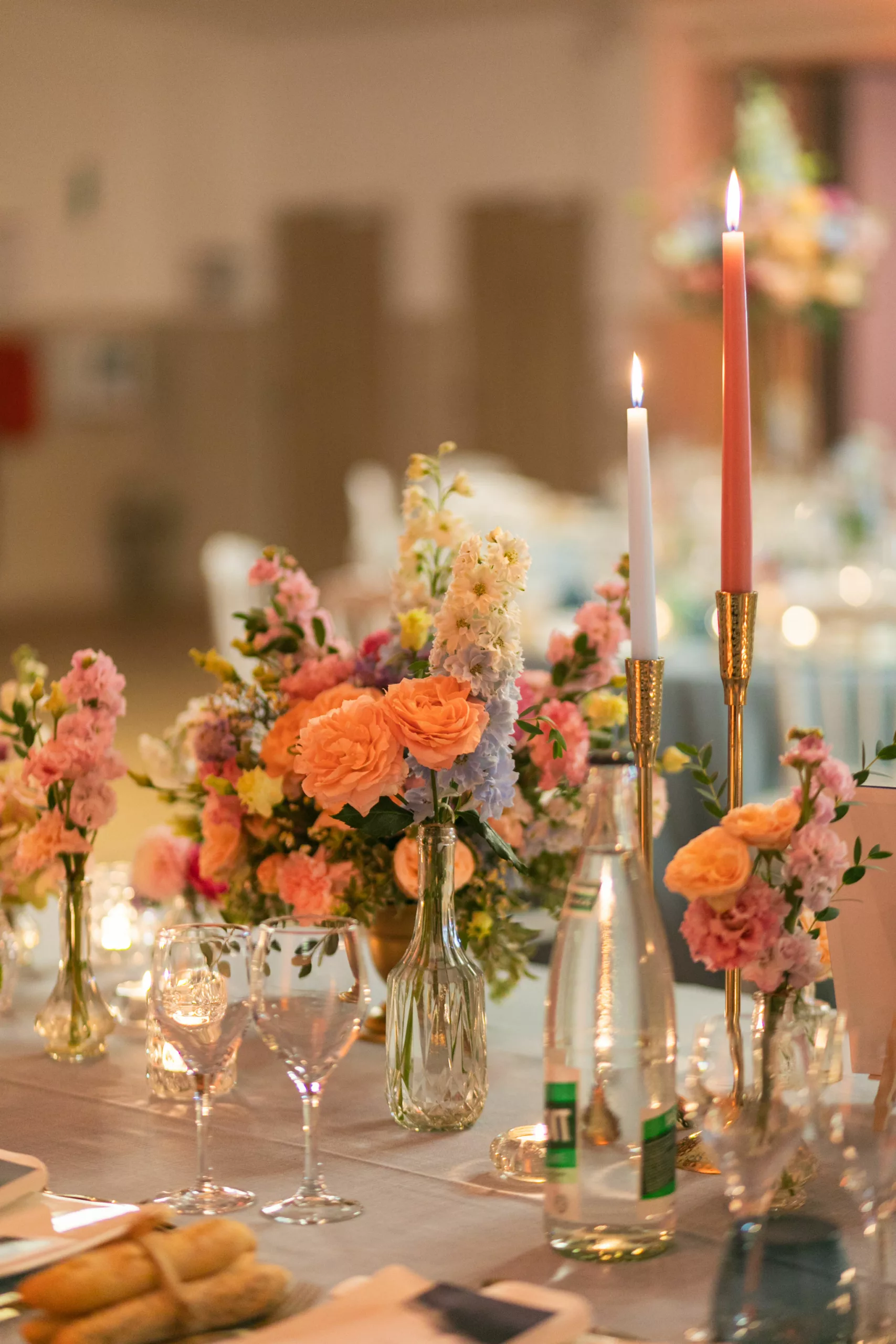 La soirée se poursuit dans une atmosphère résolument festive, entre piste de danse animée par Fiestamania et passages incontournables au photobooth de mariage, qui permet à chacun de repartir avec des souvenirs décalés et spontanés. La décoration florale, dans une palette Color Pop mêlant bleu ciel, rose, fuchsia, pêche et parme, habille les tables avec élégance. Pour immortaliser cette journée, Chloé & Étienne ont fait confiance au photographe Ronan Jegaden et au vidéaste Phénix Films, qui ont su capturer chaque instant avec justesse.